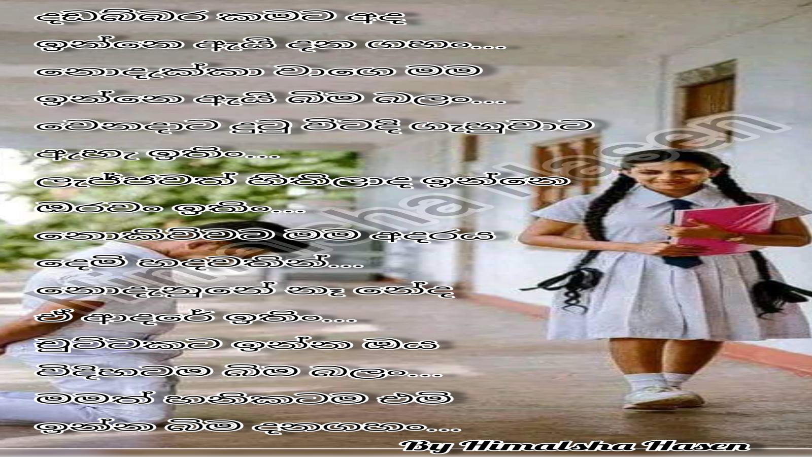 සද ගෙනා සිසිලසෙහි පහස බිදෙනා අයුරු... කියන්නද මා කෙලෙස ඔබේ සිසිලස හමුව... ආදරය වචනයක් නොවේ දිවි සැනසුමක්... කතරකදි හමු වෙනා සසරෙහිම බැදීමක්... රැවටෙනා හඩවනා සිනහවද හැඩ කරන... ප්රේමයේ අරුනැල්ල අදුරු පට නිවාලිය...