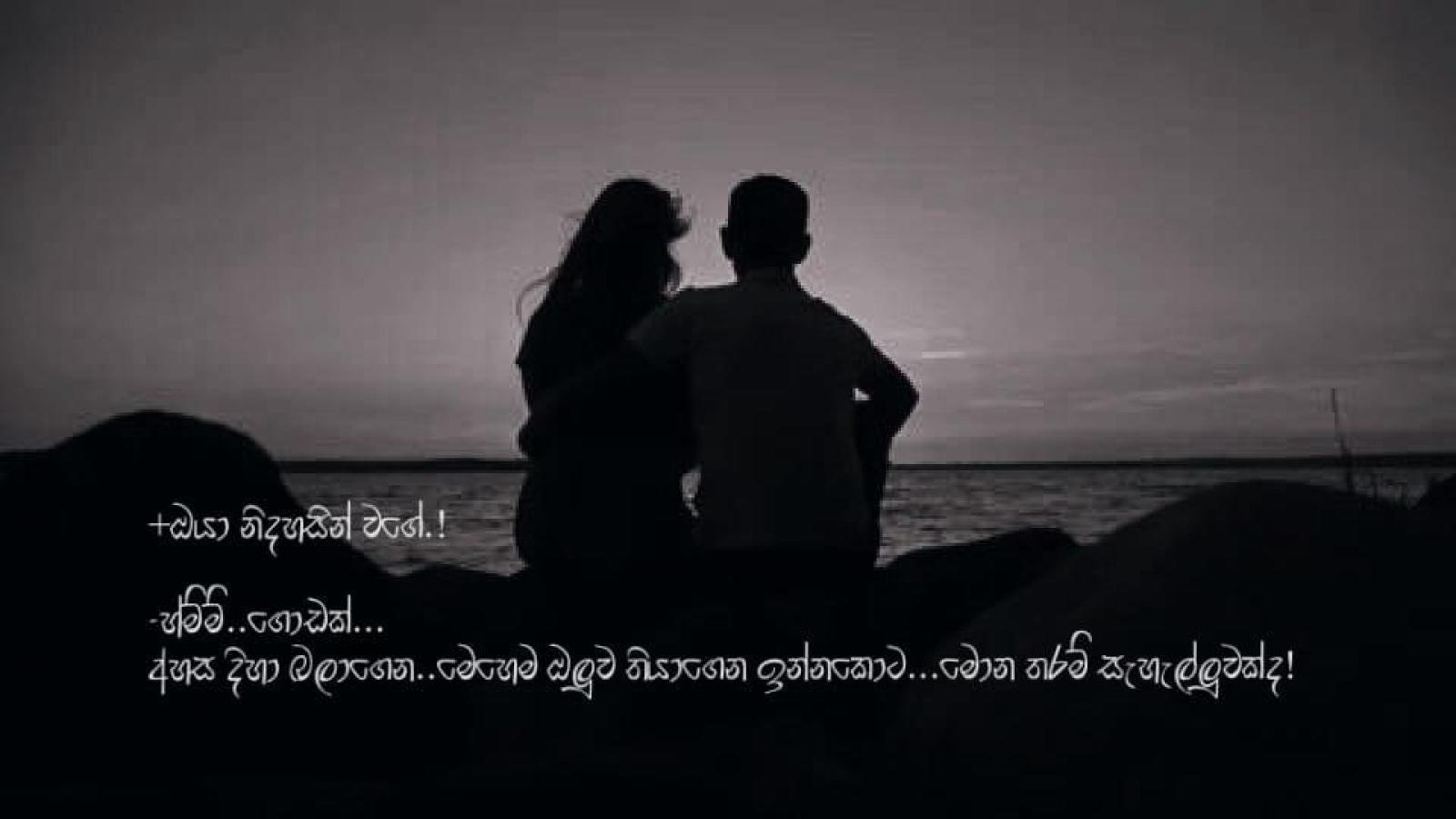 කාලයක් තිස්සෙ මම හොයපු නිදහස සැහැල්ලුව ඒ හැමදේම ඔයාගෙ උකුල උඩ ඔලුව තියාගෙන රැල්ල ගහන්න සද්දෙ අහගෙන අහස දිහා බලන් ඉන්නකොට මට දැනෙනවා..